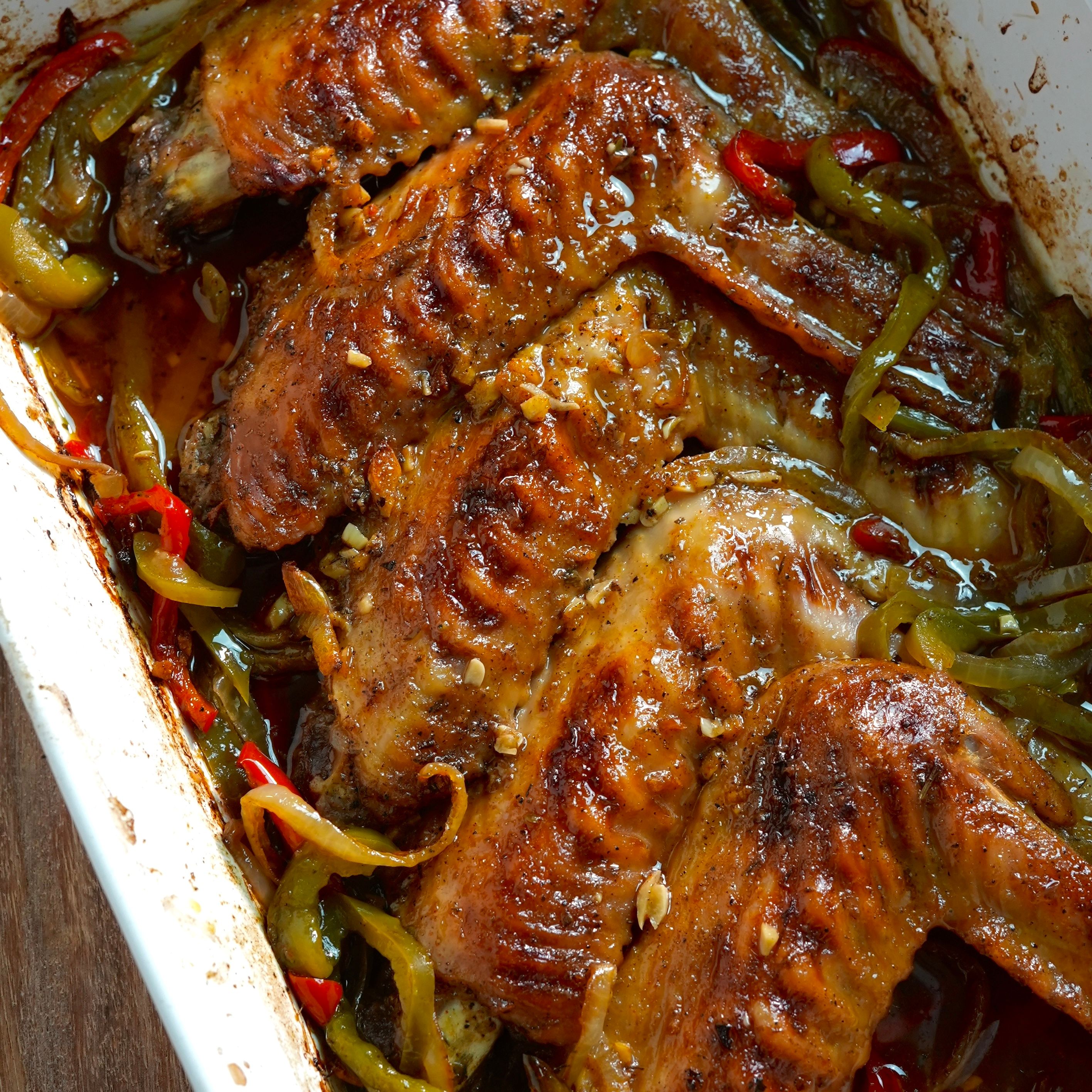 Once done, baste the turkey wings once more and serve with the basting mix, along with the onions and peppers.